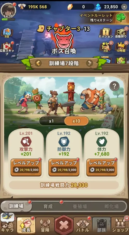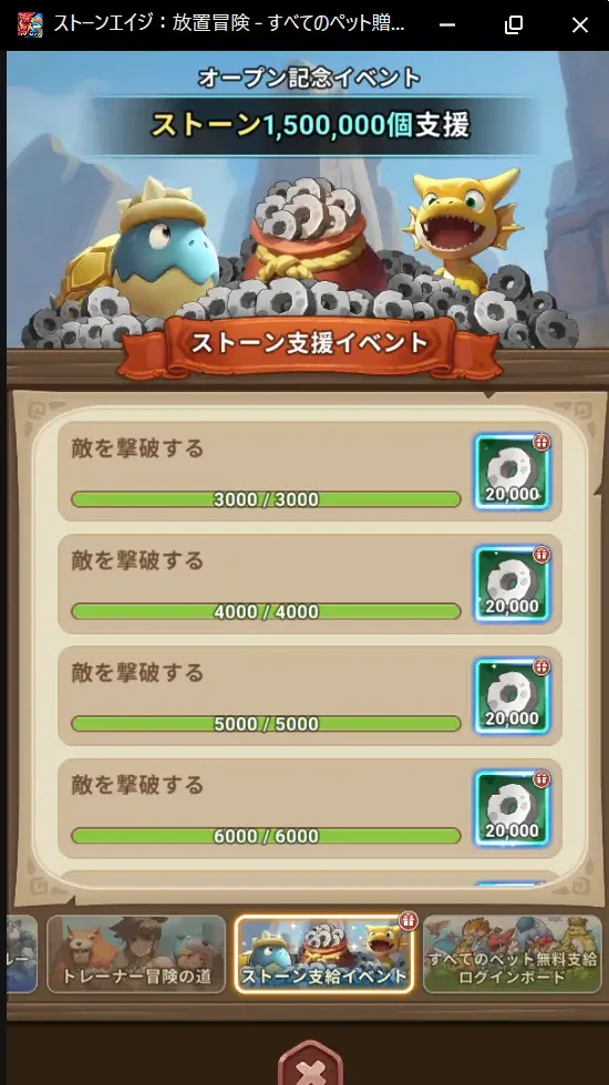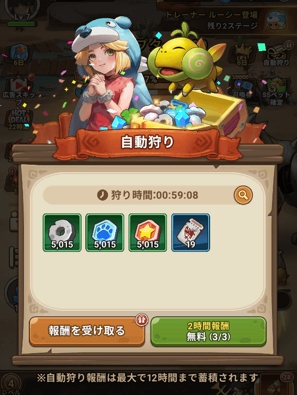 自動報酬にストーンを入手できます。自動報酬は、オフラインでもアイテムを入手できます。2時間分の報酬をスキップできる機能もあります。