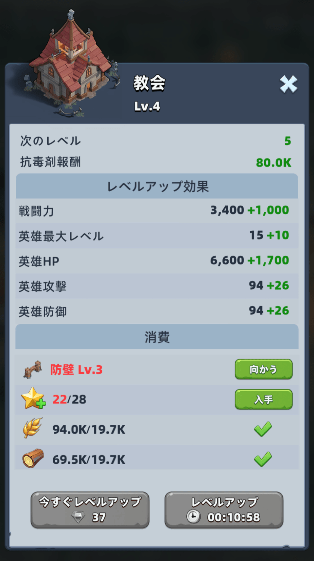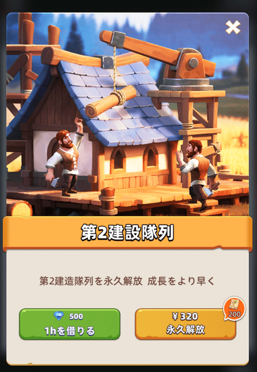 建設隊列の2つめを開放するのにダイヤを使用します。ダイヤを開放して解放した建設隊列は1時間になります。場合によっては課金で永久解放も行えます。