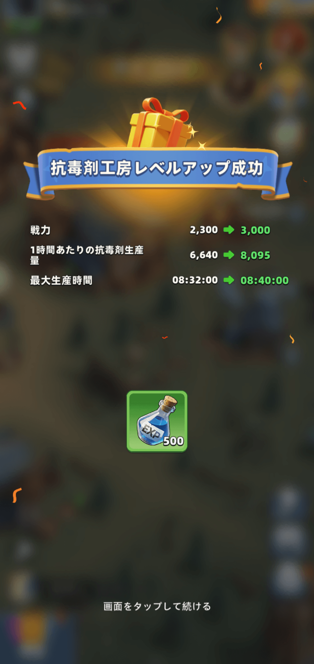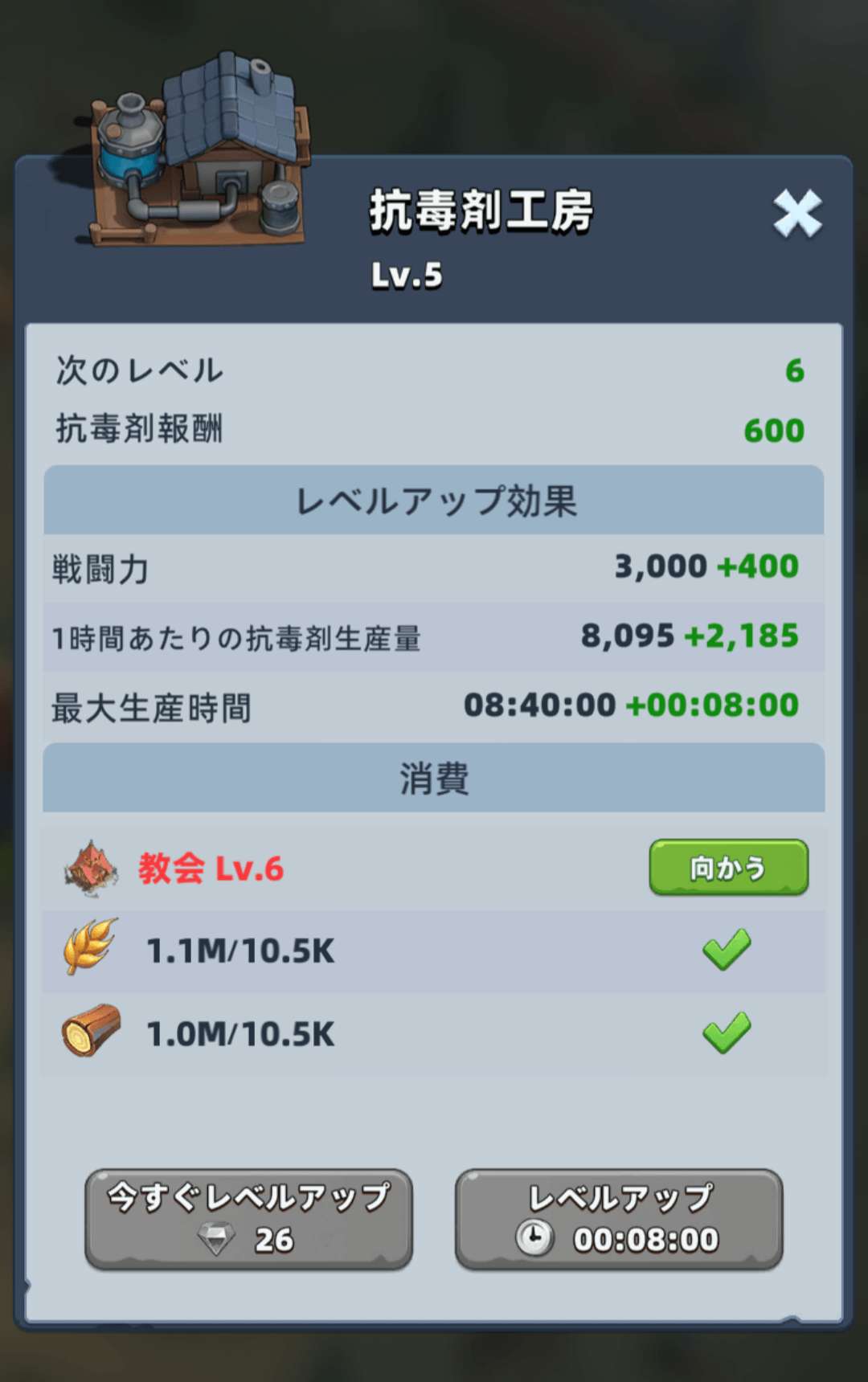 建物のレベルアップを行うことで抗毒剤を入手できます。建物のレベルアップはレベルが上がるほど時間がかかります。