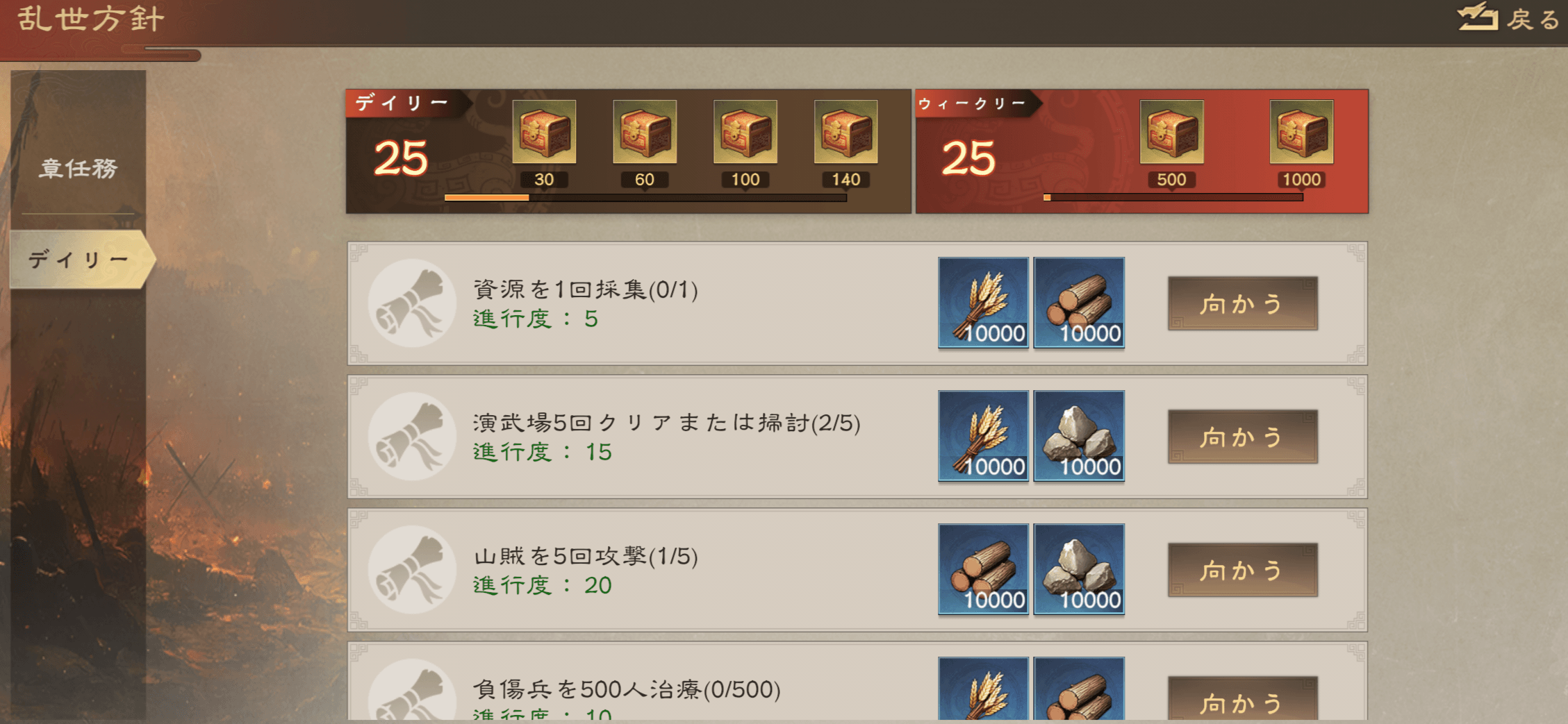 デイリーミッションで資源を入手できます。デイリーミッションは毎日行っておいた方が良いミッションです。活躍度が上がると良い報酬ももらうことができます。