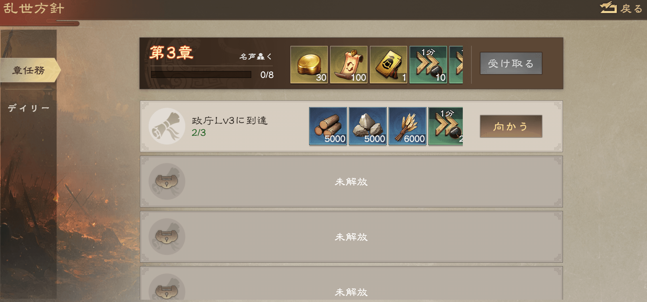 章任務で資源を入手できます。章任務はゲームを進める為に必要なミッションが多くあります。