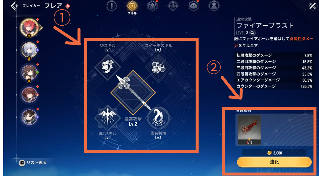 | Lv.5 | 星2スキル強化素材×15 | 5,000 |
