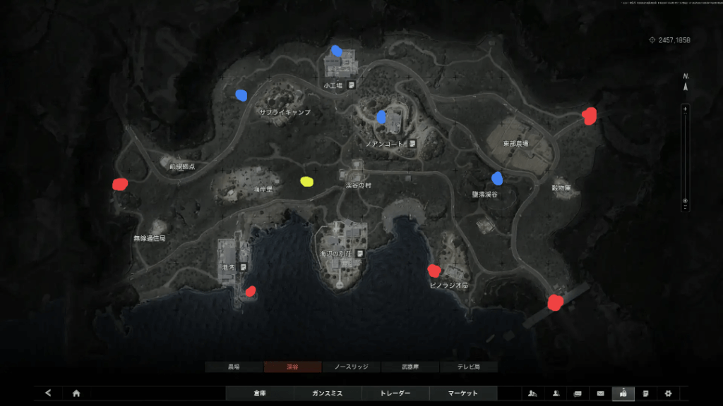 渓谷の脱出口は多く設定されていますが、その中からランダムになります。それぞれ湧き位置の反対側の2つのうちどちらかもしくは両方とマップの中央辺りの条件月当たりの脱出口が空いていることがあります。条件付き脱出