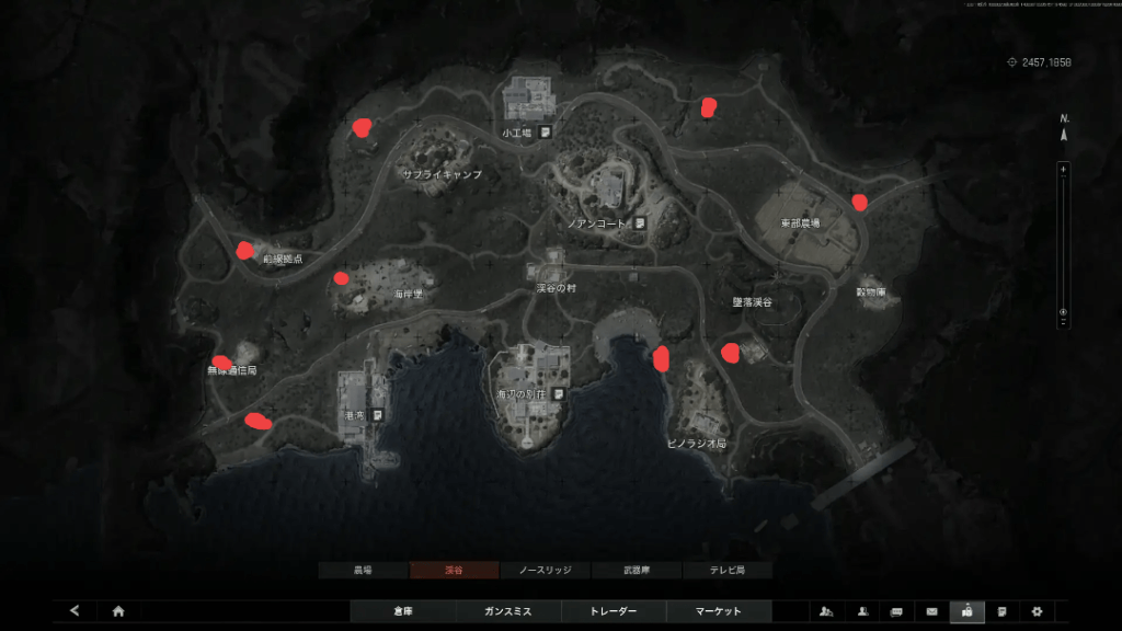 赤点があるところがプレイヤーの湧き位置です。ソロだと場所が違っていたり、少しずれている場合があります。